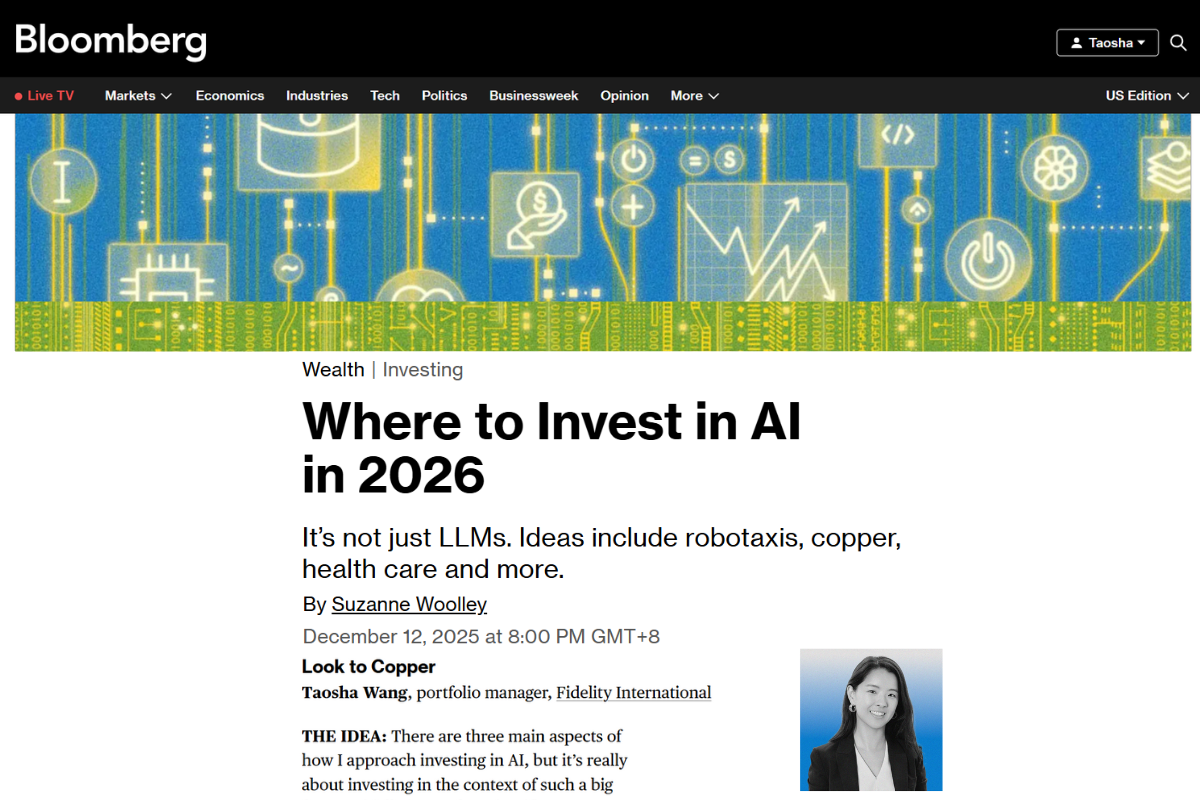 Taosha Wang is a Lead Portfolio Manager at Fidelity International. Her Macro-Thematic Growth strategies invest globally and aim to capture structural growth trends while navigating macroeconomic cycles. She is nominated as the 2025 International Investment Woman of the Year by Investment Week, a leading UK publication.
